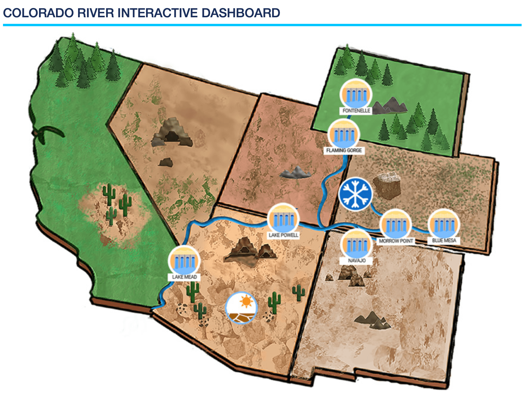 ADWR collaborates with the Bureau of Reclamation and representatives of the seven Colorado River Basin States to better prepare for Arizona's long-term needs, take an active role in water use projections, and monitor hydrologic conditions Colorado River operations. The Department also utilizes Reclamation models to evaluate various scenarios related to modifications in water use, hydrology, climate, water supply and demand, and other factors within the Colorado River Basin. Visit their Colorado River Interactive Dashboard for current conditions and updated levels of the River System.