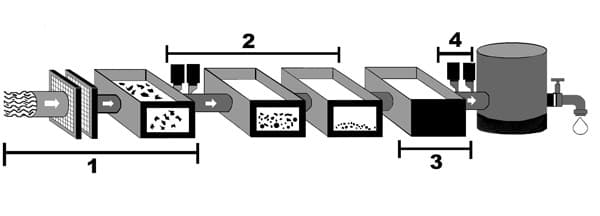 1. Screen large particles 2. Add a chemical that makes tiny particle cling and sink. 3. Filter to clean remaining particulates. 4. Disinfect and add small amount of fluoride.