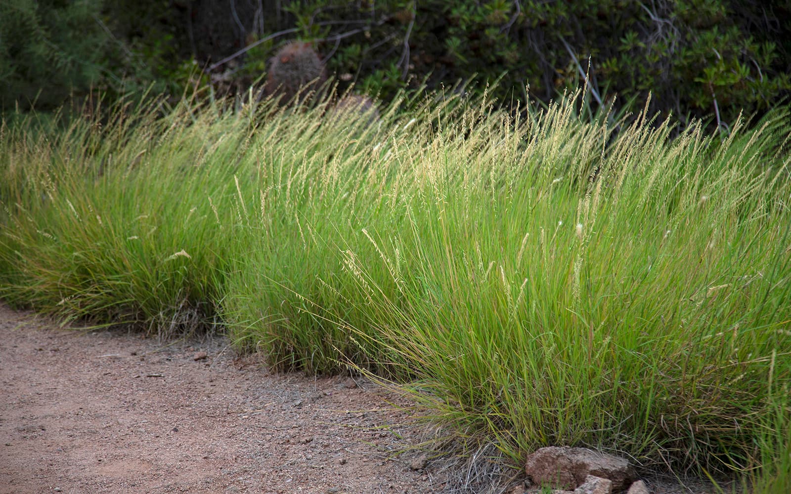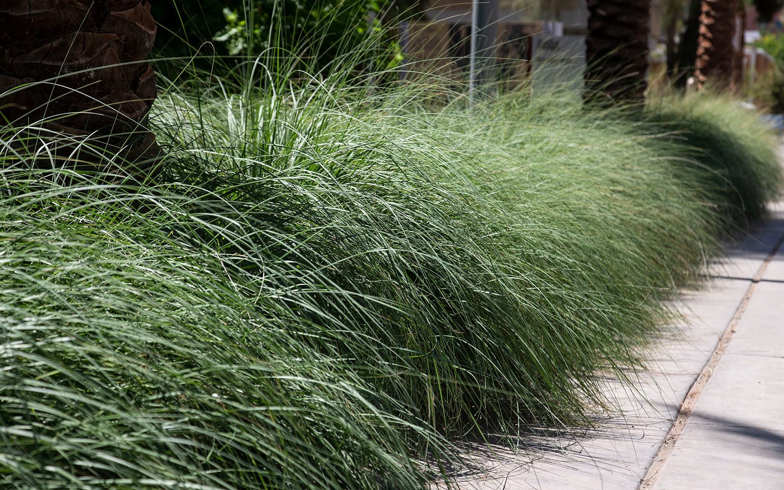 Ornamental grasses add a softening element and motion to your landscape, especially when planted next to boulders or other hard surfaces. The color and form of grasses change through the year, creating seasonal interest, and birds are attracted to seed-laden spikes after the bloom period. Many types of ornamental grass are excellent for revegetation; however, some can reseed in landscapes. Watering with drip irrigation will generally eliminate or minimize reseeding. Ornamental grasses should be watered, as you would groundcovers, not grass lawns. Rejuvenate their growth by cutting them back close to the ground every one to three years.