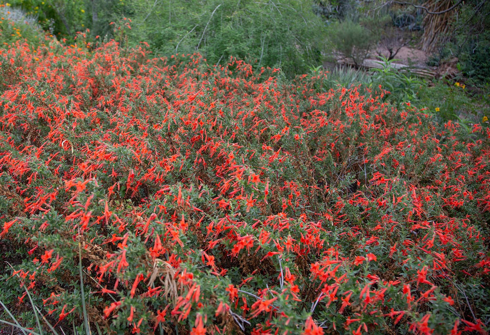 Bright orange-red trumpet flowers attract hummingbirds. Previously classified as Zauschneria California.