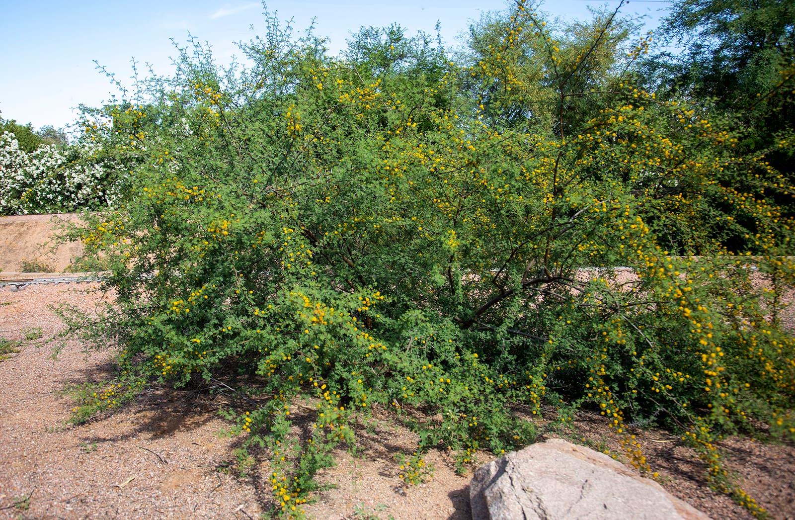 Good for naturalistic landscapes. Flowers attract bees. Seeds attract birds and other wildlife. Previously classified as Acacia constricta. Also try Senegalia greggii.